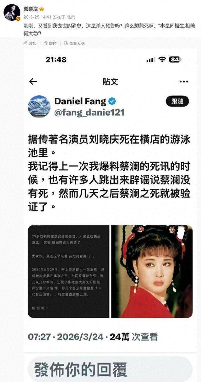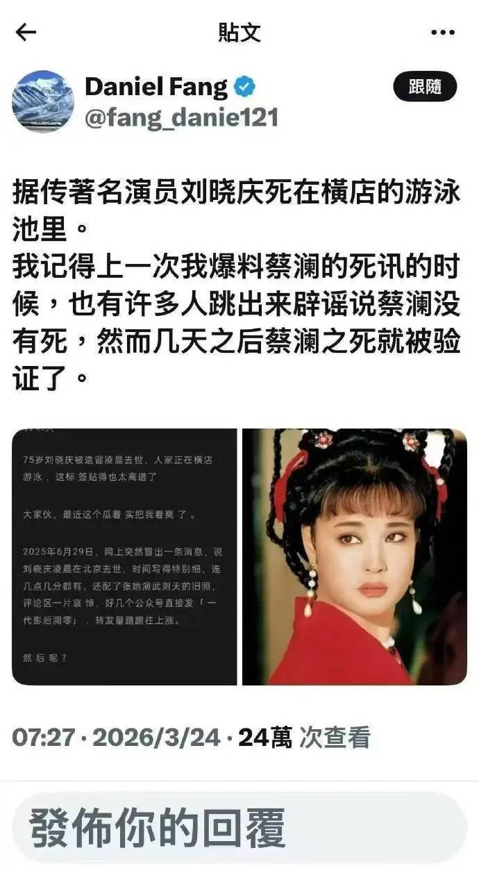 提起刘晓庆,这个名字几乎刻在几代人的记忆里。从《小花》里的青涩少女到《武则天》中的霸气女皇,她的演艺生涯跌宕起伏,却始终像野草般顽强生长。可谁也没想到,75岁的她月又因一场恶毒谣言被推上风口浪尖——刘晓庆深夜去世的消息突然刷屏网络,连具体细节都编得有模有样。这场闹剧的开端,要𱐏日说起。一个境外社交账号突然发布消息,声称刘晓庆在浙江横店拍戏时,于剧组附近的泳池意外离世。更阴险的是,造谣者还故意把这条假消息和美食家蔡澜的真实死讯绑在一起,想借真实事件的热度蒙骗网友。短短几小时,谣言就像病毒一样蔓延,微博、短视频平台全是相关讨论,惋惜声和质疑声搅成一团。